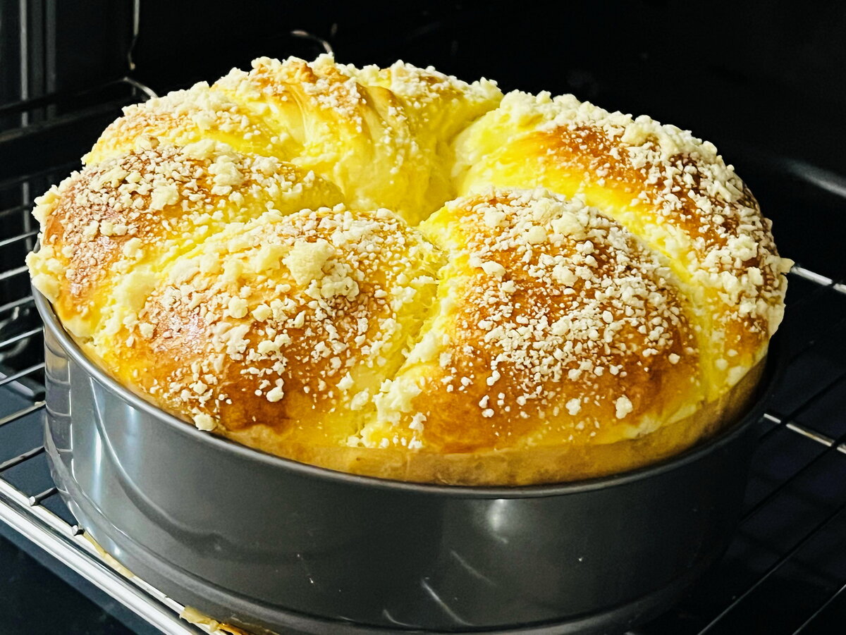 После этого оставьте калач в теплом месте на 30 минут, чтобы он поднялся. Затем выпекайте в разогретой до 170 градусов духовке около 35 минут до золотистой корочки. Дайте остыть и подавайте на стол. Вкусовые качества этого калача обязательно порадуют ваших гостей.