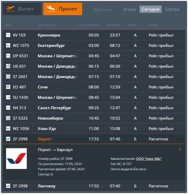 На электронном табло аэропорта им. Г. С. Титова обновилось время прилета рейса ZF - 2998.