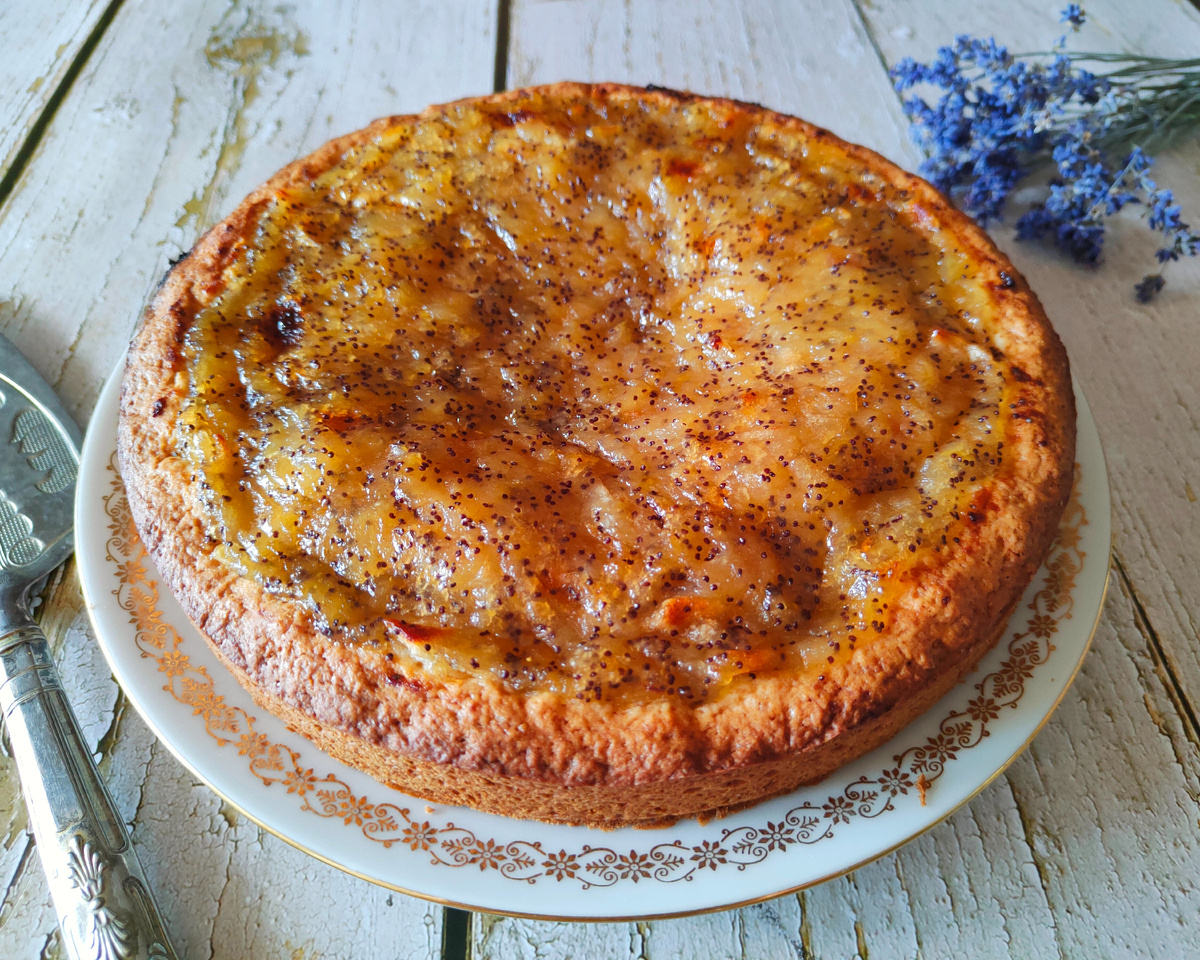 Тем временем, яблоки очищаются и нарезаются кубиками, которые обжариваются на сливочном масле с добавлением цедры и сока лимона, сахара и при желании мака и кардамона. Начинка готовится до испарения сока, и затем выкладывается на охлажденное тесто.