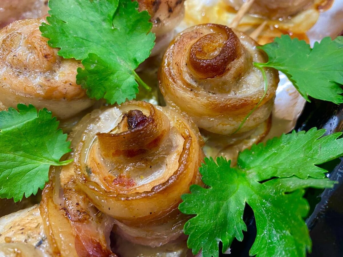 После маринования каждый кусочек заворачивается в бекон и насаживается на шпажку. Блюдо можно запечь в разогретой до 200°С духовке в течение 40 минут или приготовить на мангале. Результат — аппетитные мясные «цветы»!