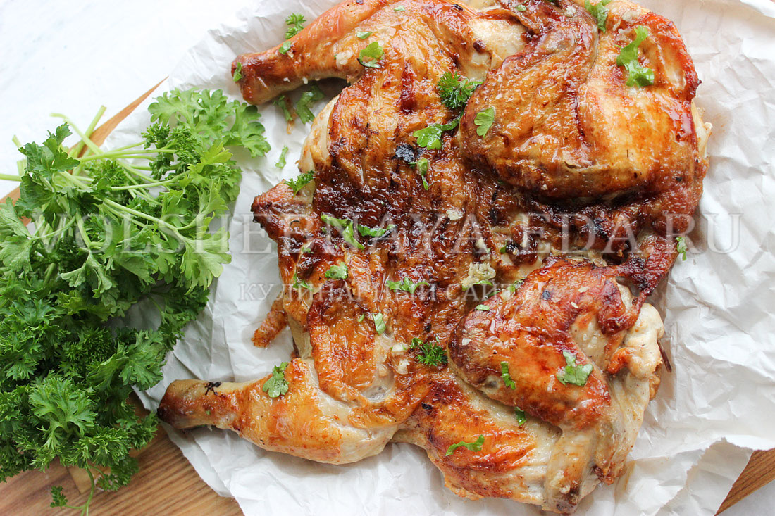 Перед жаркой птицу промывают и слегка обрабатывают, чтобы убрать лишние остатки. Разрезают вдоль груди, сохраняя спинку цельной, чтобы площадь контакта с жаром была максимально большой. Молоток для отбивания помогает сделать мясо ровнее, без повреждения кожи.