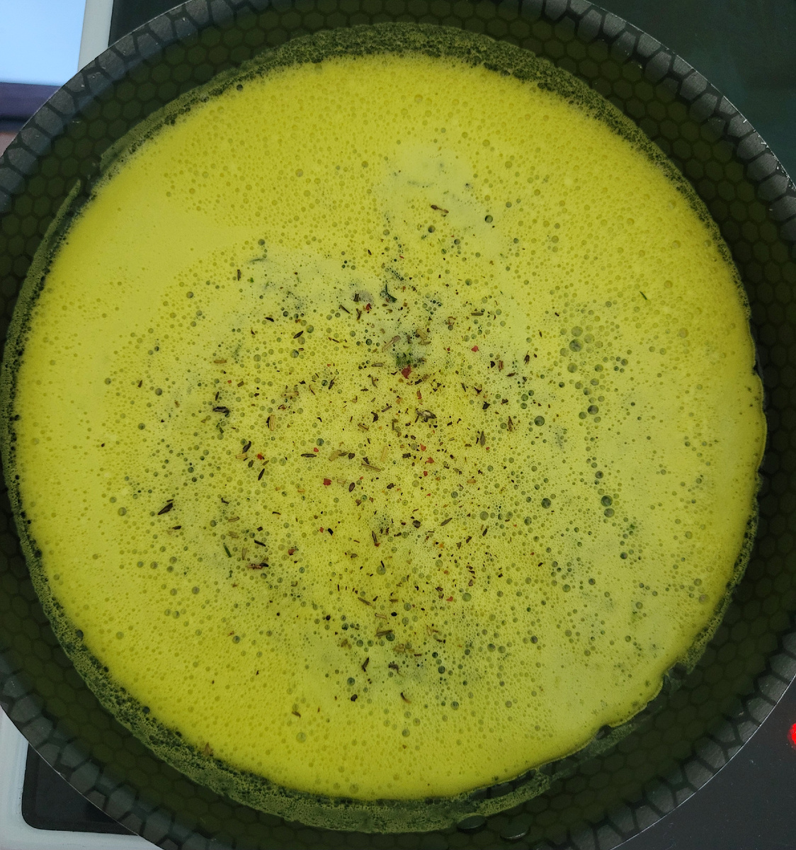 На две порции понадобятся 4 яйца и около 25 г рукколы. Взбить их вместе, добавить укроп и соль по вкусу, перемешать. Жарить на разогретой сковороде под крышкой на среднем огне, предпочтительно на масле гхи. Когда омлет схватится, сверху можно присыпать сыром или выбрать другую начинку согласно настроению.