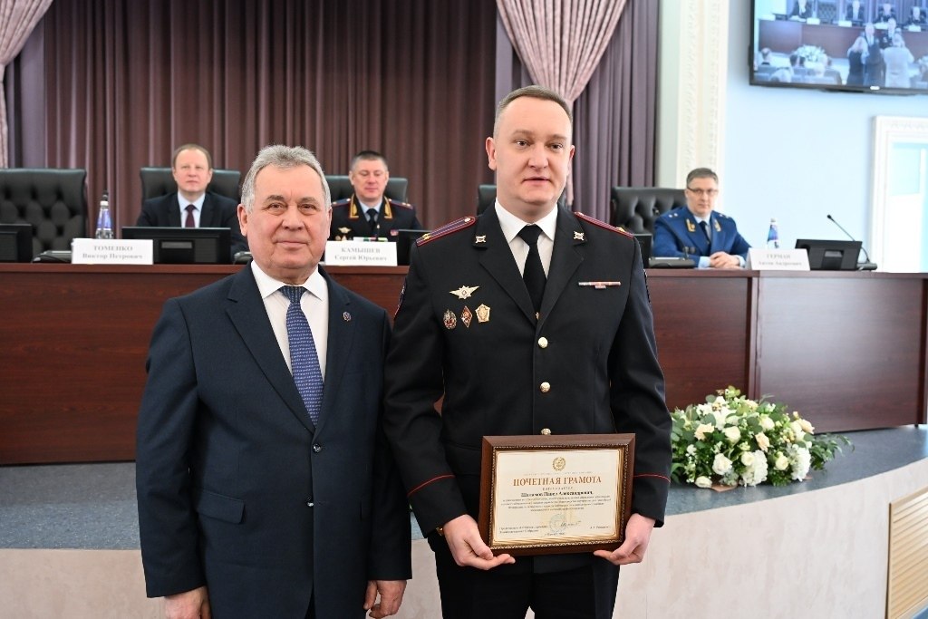 Спикер АКЗС Александр Романенко отметил профессионализм и слаженность работы алтайских правоохранителей. «Органы внутренних дел эффективно выполняют свою работу. Продолжается снижение числа зарегистрированных преступлений. Соцопросы показывают очень высокий уровень доверия населения к органам полиции. Это доверие - результат вашей честной службой и системной работой по улучшению взаимодействия с людьми, по устранению имеющихся недостатков», - отметил он.