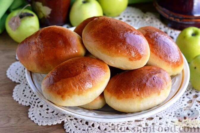 - Дрожжевые пирожки с яблоками — пышные, долго не черствеющие булочки с тушёной яблочной начинкой, ароматизированной небольшим количеством рома и пряностей.