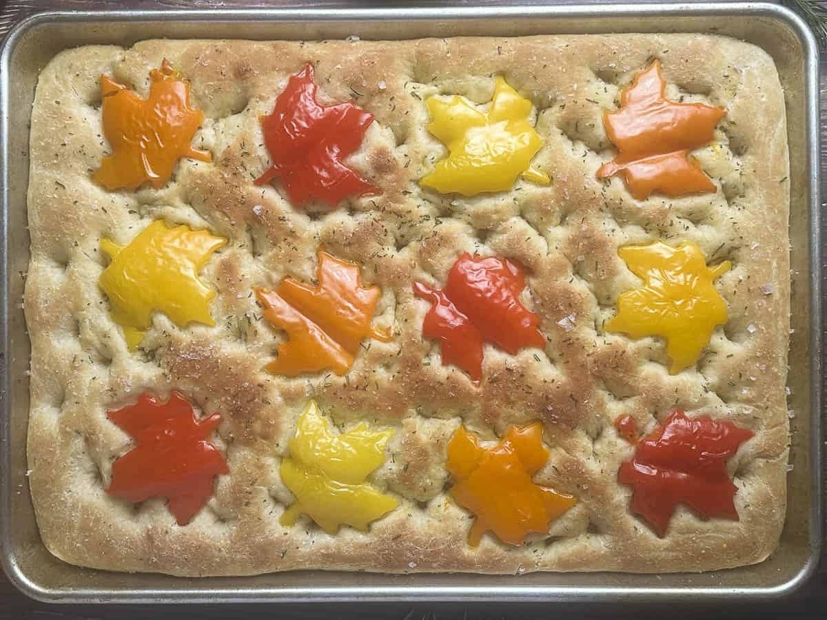 Ароматная фокачча, украшенная разноцветными болгарскими перцами в форме кленовых листьев, станет идеальным дополнением осеннего стола. Этот уютный хлеб не только порадует глаз, но и подарит замечательный вкус, объединяя теплые оттенки творчества и сезонных продуктов.