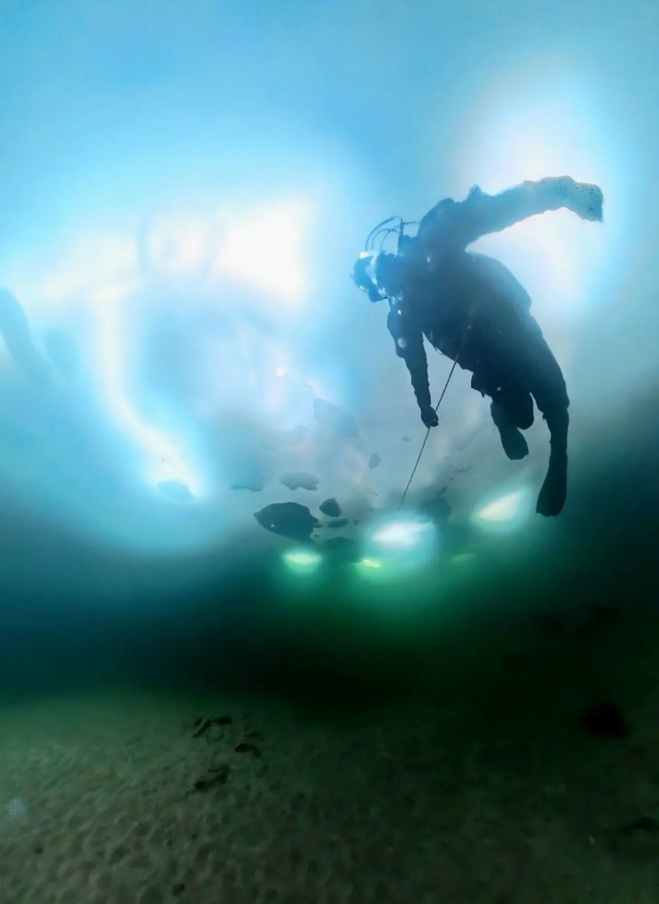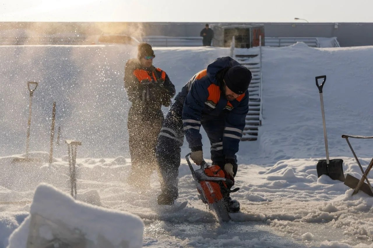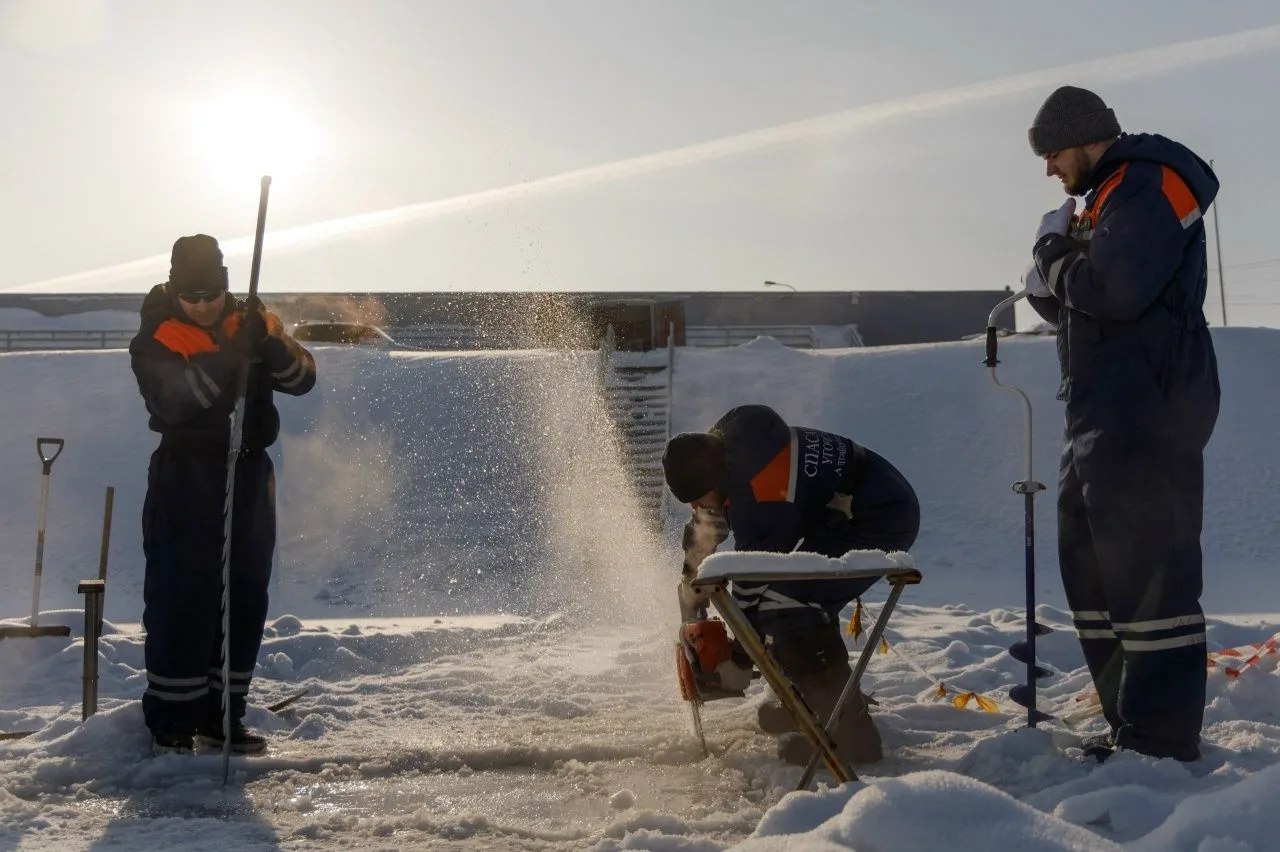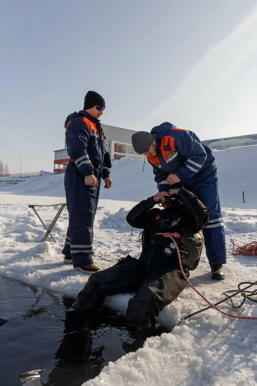 Перед тем как водолаз совершит спуск под воду, проводится большая подготовительная работа. Сначала необходимо оборудовать прорубь: расколоть прочный лёд, вручную вытащить тяжёлые ледяные глыбы, обеспечить безопасный доступ к воде и надёжную страховку. Это отдельный, трудоёмкий этап, без которого подлёдное погружение просто невозможно.