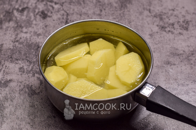 Для начала потребуется подготовить базу картофель. Вырезают 350-400 г корнеплодов, нарезают крупными кусками и погружают в воду. Варить их нужно до легкой мягкости примерно 20-30 минут. Пока картофель готовится, можно заняться ароматным компонентом: 80-100 г подкопчённого бекона нарезать полосками, 80 г лука-порея тонкими кольцами, а одно зубчик чеснока нарезать мелко.