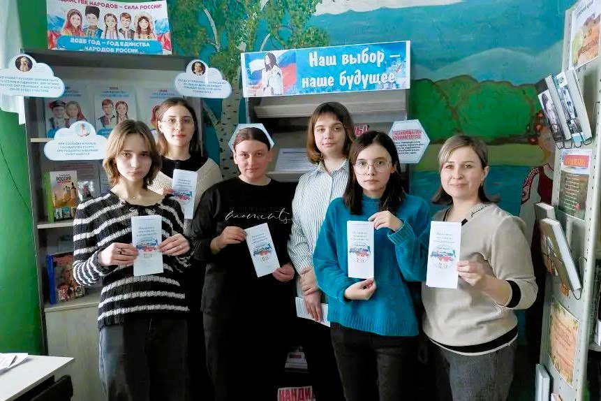 Наталья Греб, сотрудник библиотеки и по совместительству секретарь участковой избирательной комиссии, знакомит молодежь села с тонкостями избирательного процесса. На выставке представлена актуальная полезная информация о выборах, главный закон страны Конституция Российской Федерации, а также буклет для впервые голосующих Памятка молодому избирателю.
