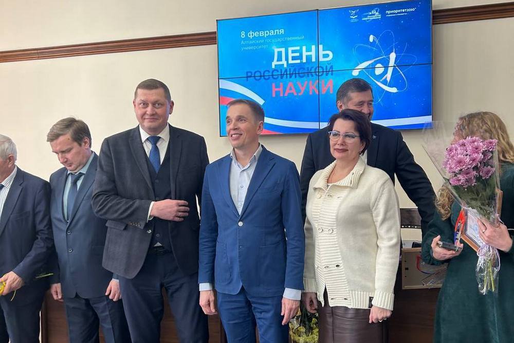 Александр Молотов поздравил коллектив Алтайского госуниверситета с Днем российской науки, пожелал начинающим и уже маститым ученым новых открытий и вручил награды Алтайского краевого Законодательного Собрания.
