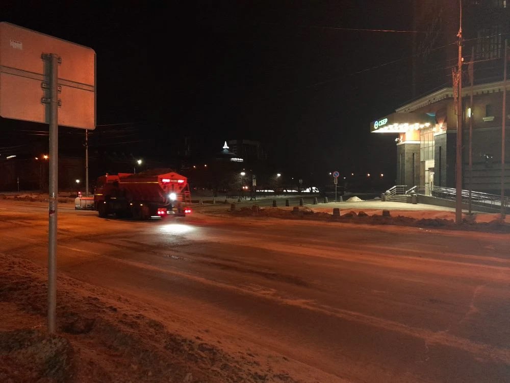 В ночь с 11 на 12 февраля МБУ «Автодорстрой» проводило противогололёдную обработку улиц Барнаула изза неблагоприятных погодных условий.