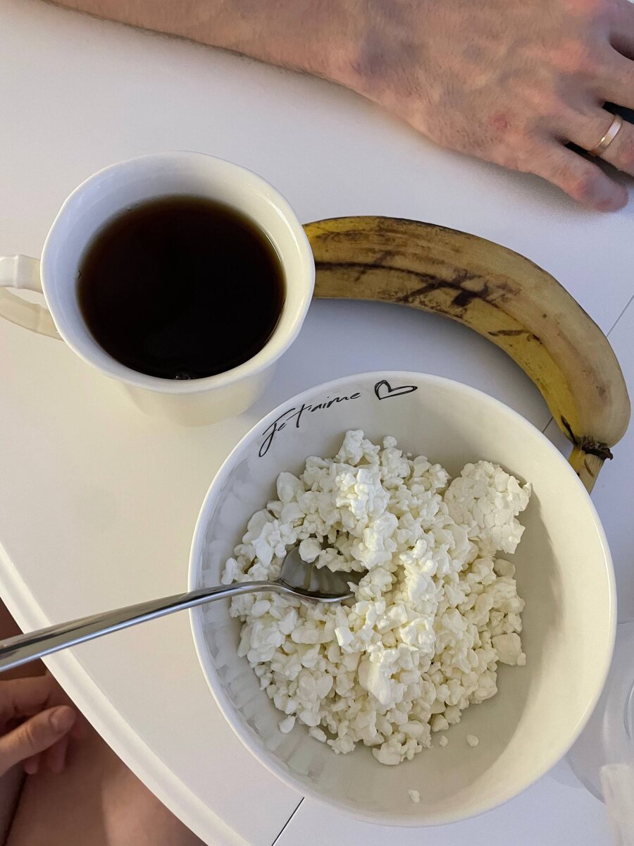 - Завтрак: Творожное лакомство с бананом и хрустящим кусочком хлеба.