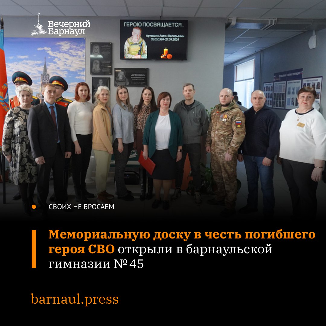 12 февраля в гимназии №45 состоялось торжественное открытие памятной доски выпускнику учебного заведения Антону Артюшину, который погиб при выполнении боевого задания в зоне проведения специальной военной операции.