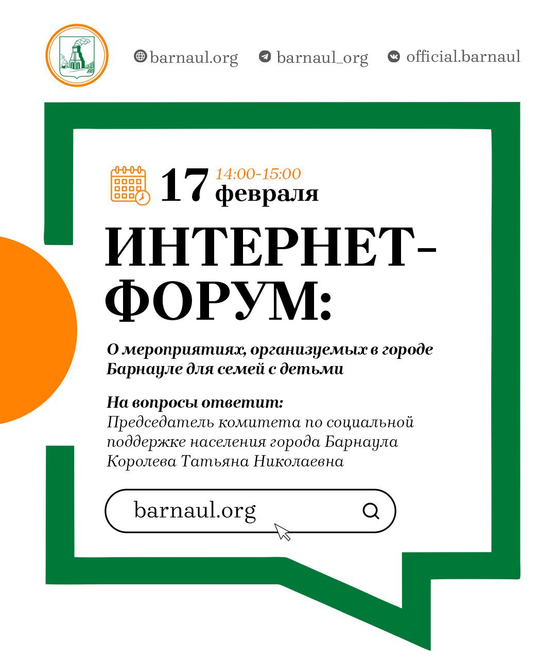 Завтра, 17 февраля, с 14.00 до 15.00 на официальном интернет-сайте города Барнаула пройдет интернет-форум.