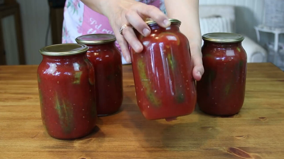 После этого с огурцов сливают воду, добавляют уксус, а затем заливают банки горячим томатным маринадом, заполняя их почти до верха. Закатывают крышками и переворачивают на 2-3 часа. Укутывать банки не нужно, иначе огурцы могут стать мягкими. После остывания их убирают на хранение.