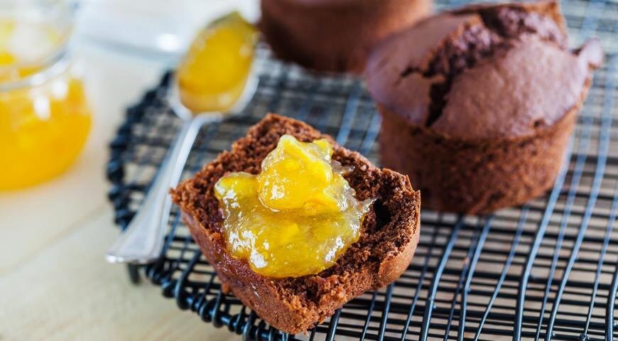 Шаг 4: Подготовьте формочки для маффинов, смазав их растительным маслом или используя бумажные вкладыши. Заполните формочки тестом наполовину, сделайте углубления и добавьте по 1 ч. л. апельсинового джема. Затем разложите оставшееся тесто.