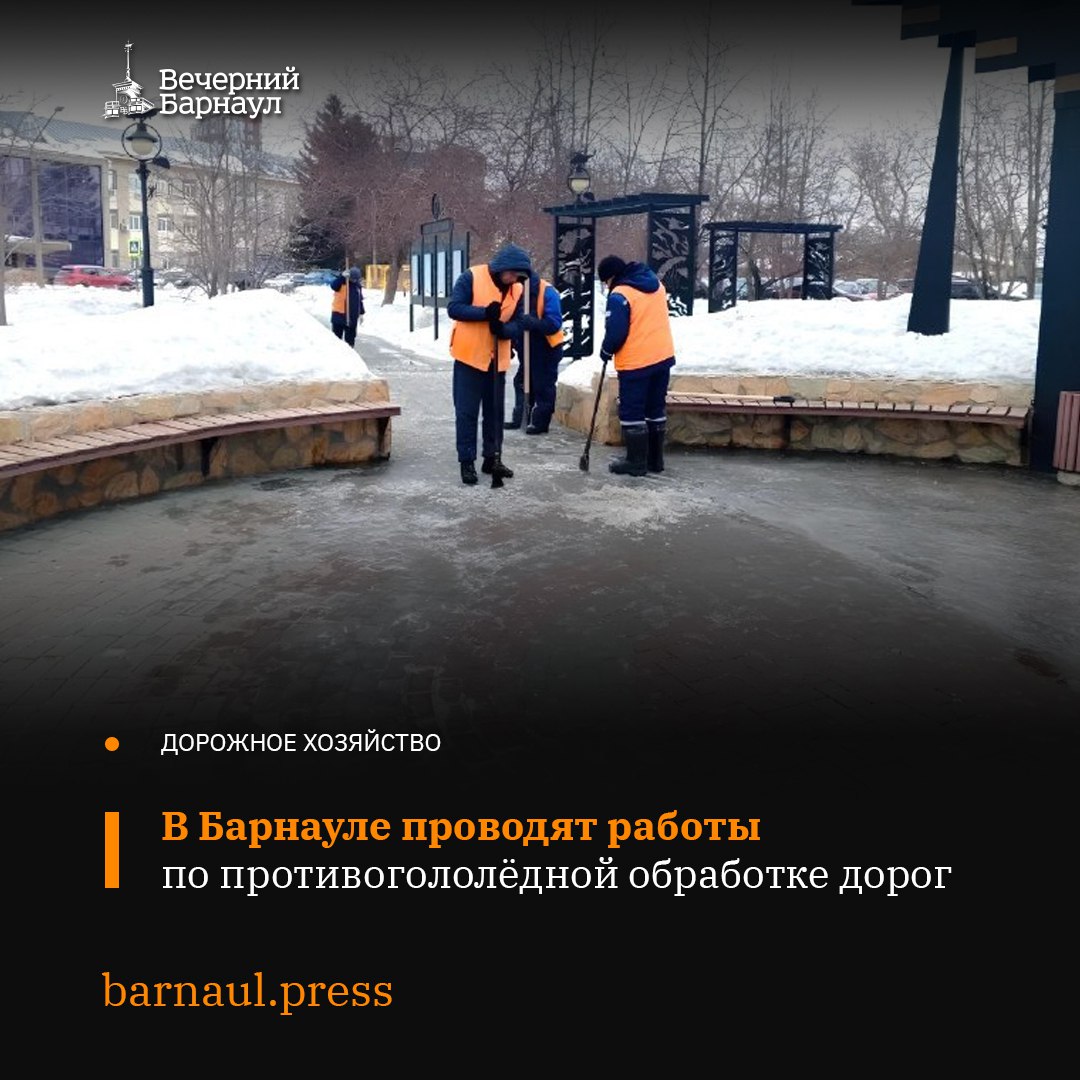 Сильная гололедица образовалась на дорогах и тротуарах столицы Алтайского края из-за потепления и последующего похолодания. Сотрудники МБУ «Автодорстрой» проводят противогололёдную обработку вышеуказанных объектов в две смены.