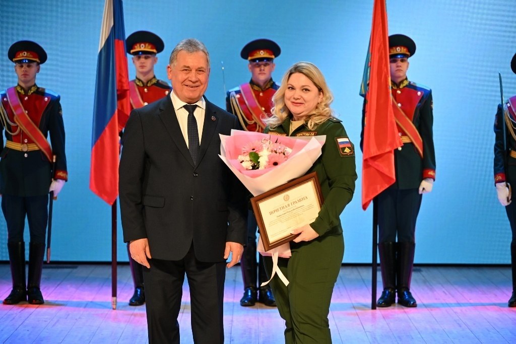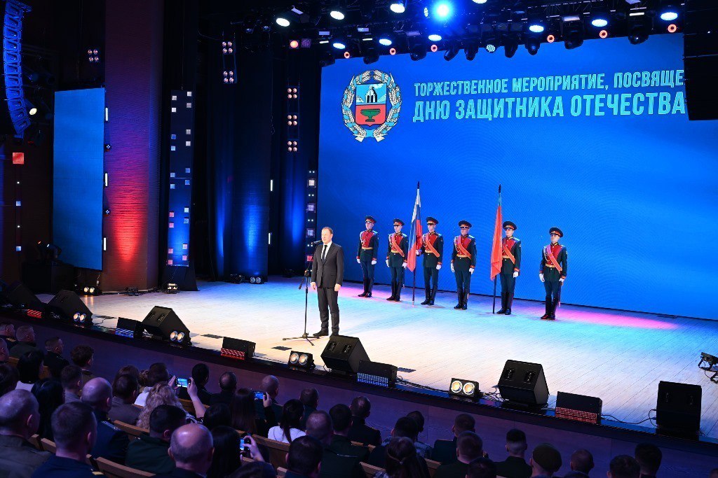 Председатель АКЗС Александр Романенко обратился к участникам торжественного собрания от имени депутатов краевого парламента. «Сегодняшний праздник имеет глубокое значение, он отражает благодарность всем защитникам нашего Отечества, нашей России на всем ее историческом пути: от Александра Невского и героев Великой Отечественной войны до наших ребят и девушек, которые сегодня защищают честь и независимость нашей страны на полях специальной военной операции», — сказал он.
