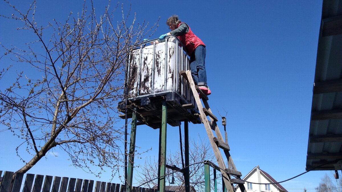 Основой новой системы стал пластиковый накопительный бак, который установлен на высоте трёх метров для обеспечения хорошего давления. Чтобы это сделать, была создана жёсткая конструкция из профильных труб, которые надежно закреплены в земле. Поливочная система включает трубы ПНД, которые помогают поднимать воду на нужную высоту и выдерживают морозы, так как краны снимаются на зиму для сохранности.