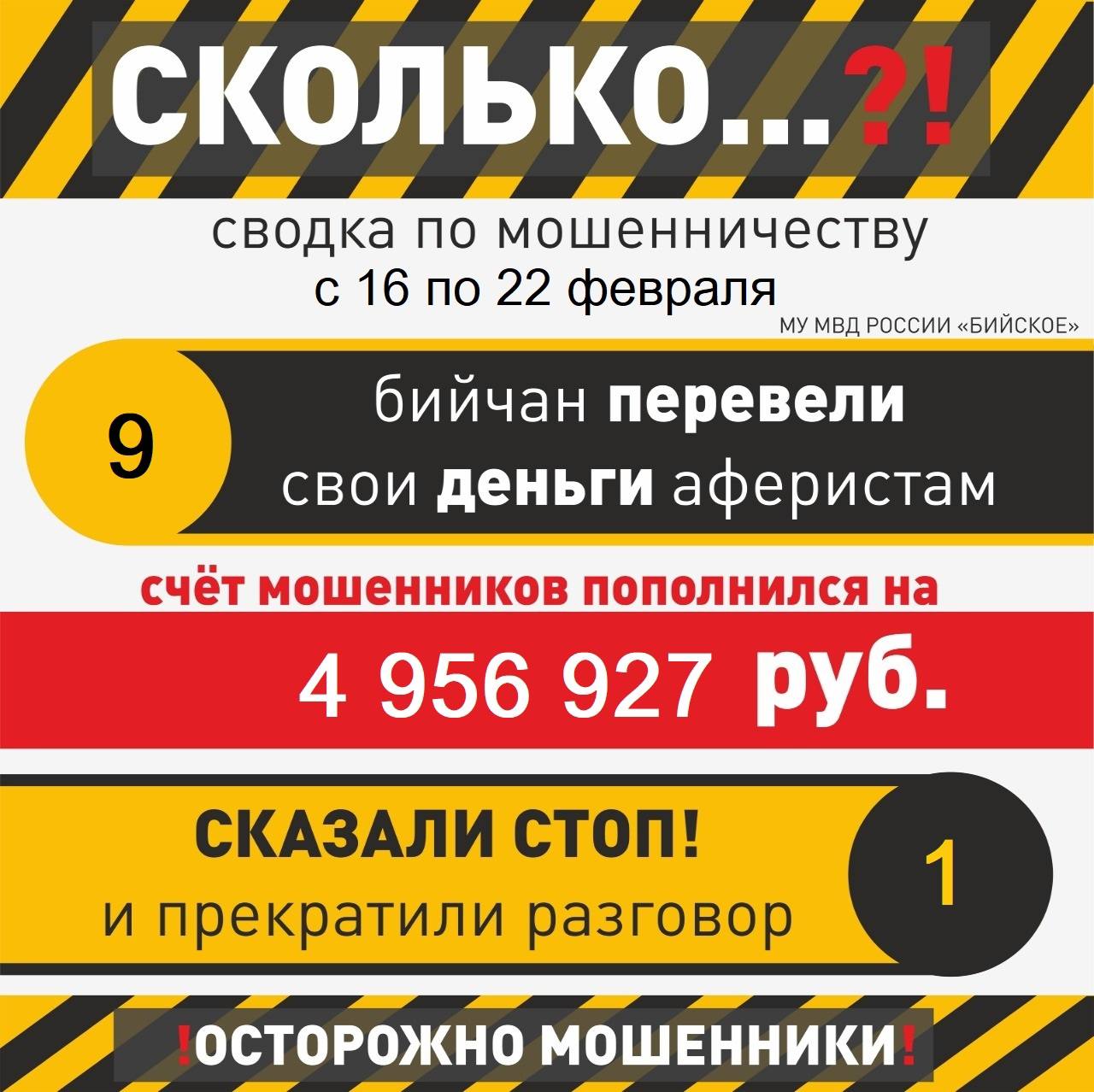 С 16 по 22 февраля в дежурную часть бийской полиции обратились 11 жителей, столкнувшихся с мошенниками. Общая сумма ущерба за неделю составила 4 956 927 рублей. И это снова результат давно известных, но по-прежнему рабочих схем.