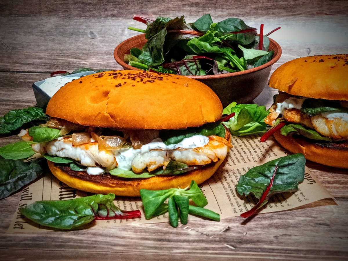 На гриле обжарьте булочки, смазанные майонезом. Соберите сэндвич, начиная с нижней булочки: укропный соус, салат, кусочек трески, снова соус, карамелизированный лук и верхняя булочка.
