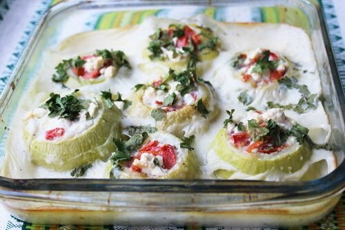 Помидоры нарезать кубиками, лук — мелко нашинковать, брынзу — раскрошить. Чеснок выдавить через пресс. Все ингредиенты смешать с небольшим количеством соли и перца, затем нафаршировать этим составом патиссоны и расположить их в форме для запекания.