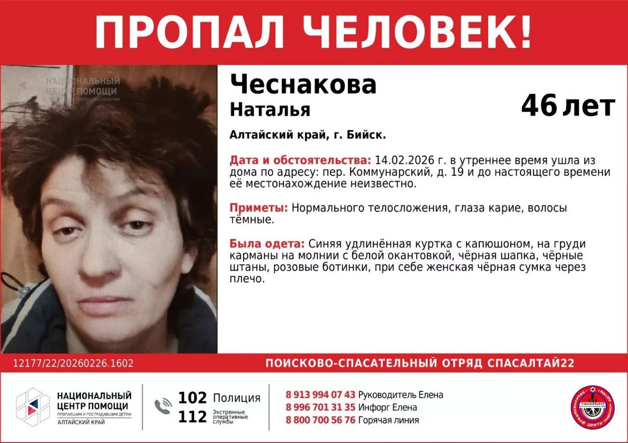 14 февраля Наталья Чеснакова в утреннее время ушла из дома по адресу: пер. Коммунарский, д. 19, и до настоящего времени местонахождение неизвестно.