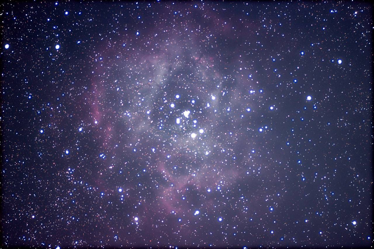Главным объектом съемки стала Туманность Розетка — огромная область ионизированного газа в созвездии Единорога, расположенная примерно в 5200 световых годах от Земли. Чтобы "вытянуть" слабое свечение водорода вокруг молодого звездного скопления, фотограф провел более полутора часов в экспозиции, работая вдали от любых источников искусственного света.