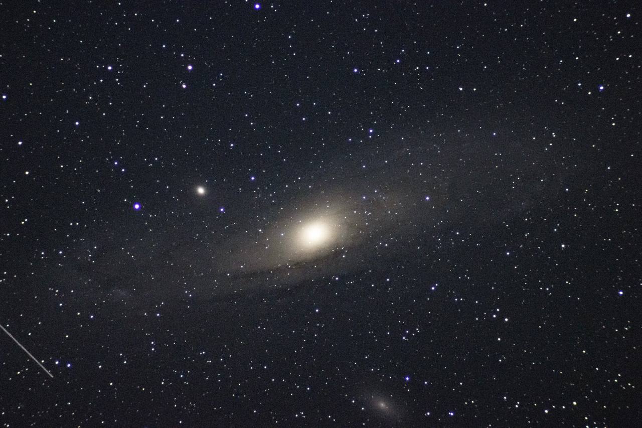 В ту же ночь в кадр попала и Галактика Андромеды — ближайшая к Млечному Пути крупная галактика, содержащая около триллиона звезд. Этот гигантский объект не просто сосед нашей галактики: Андромеда медленно, но неуклонно сближается с нами, и через миллиарды лет две системы сольются.