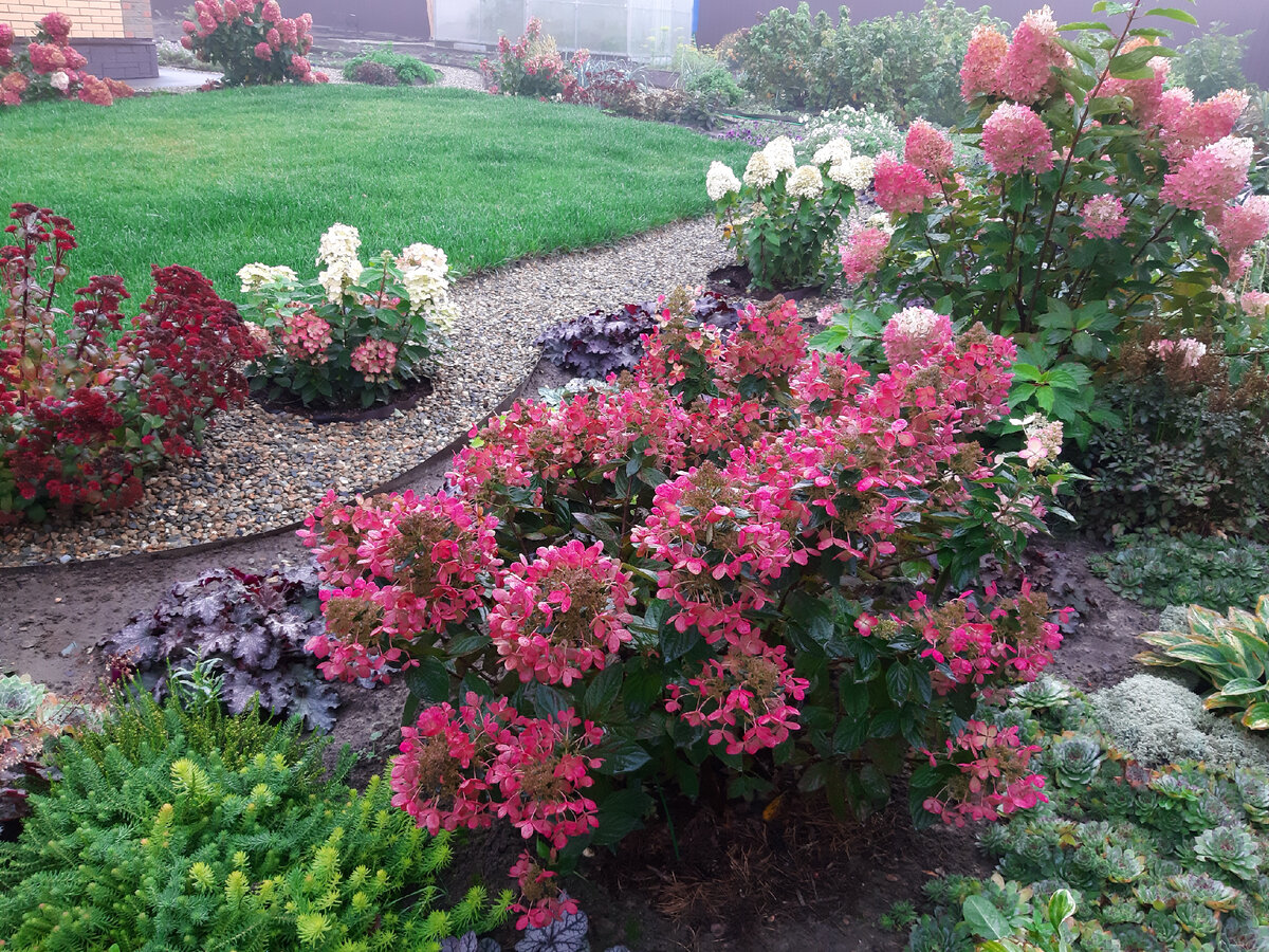 Например, гортензии радуют своей яркой палитрой. Их цветение набирает силу, и выглядят они особенно живописно. Однако не все сорта могут похвастаться такой стойкостью. Из 26 кустов, два сорта Vanille Fraise не выдержали натиска осадков и полегли. Опора не была установлена вовремя, что, возможно, и стало причиной их гибели.