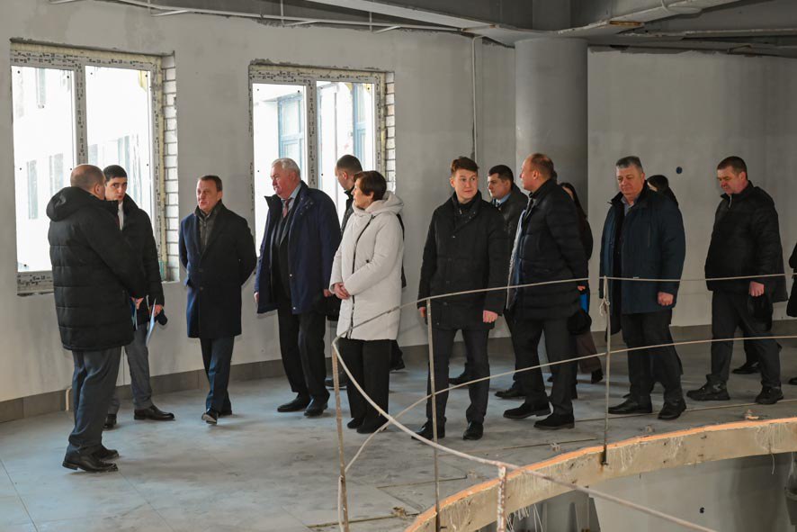 Глава города Вячеслав Франк, председатель Барнаульской городской Думы Галина Буевич, заместитель председателя АКЗС Денис Голобородько, первый заместитель главы администрации города Андрей Федоров, депутат БГД Дмитрий Аганов и генеральный директор ООО «ГК «Союз» Владимир Отмашкин проинспектировали ход строительства новой школы в квартале 2033 (ул. Попова, 130).