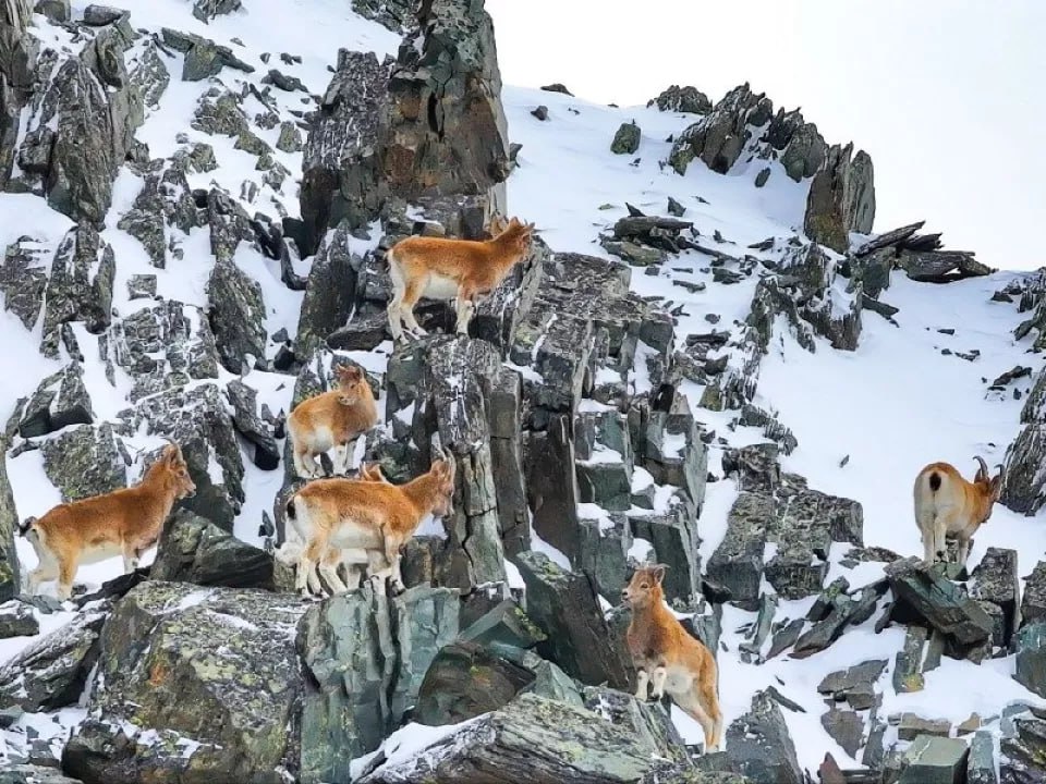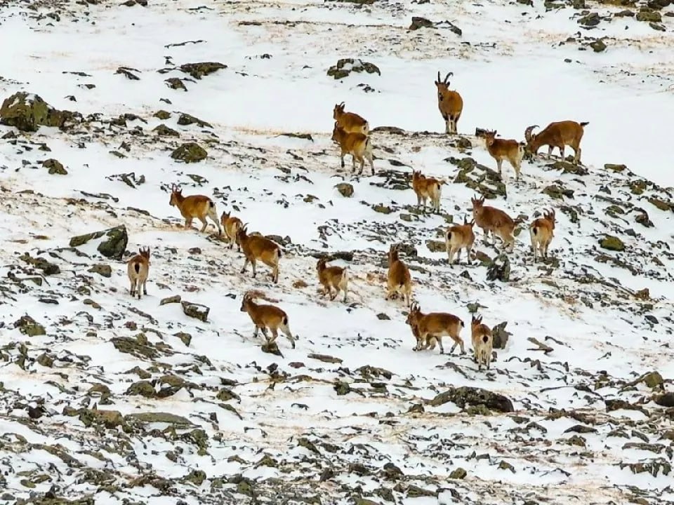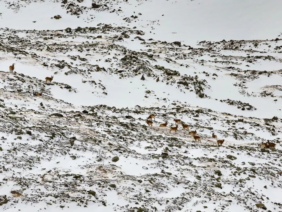 В кадр сотрудников Алтайского заповедника попала одна из немногих встреч с сибирским горным козлом во время учета снежного барса. Их встретили на хребте Чихачева на границе России и Монголии.
