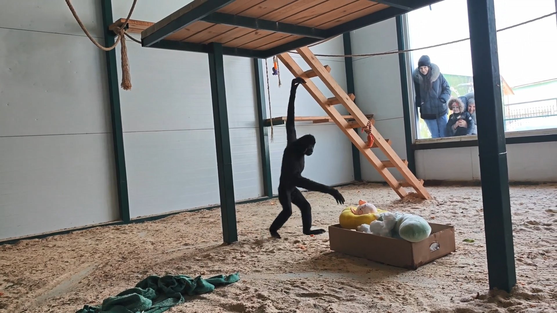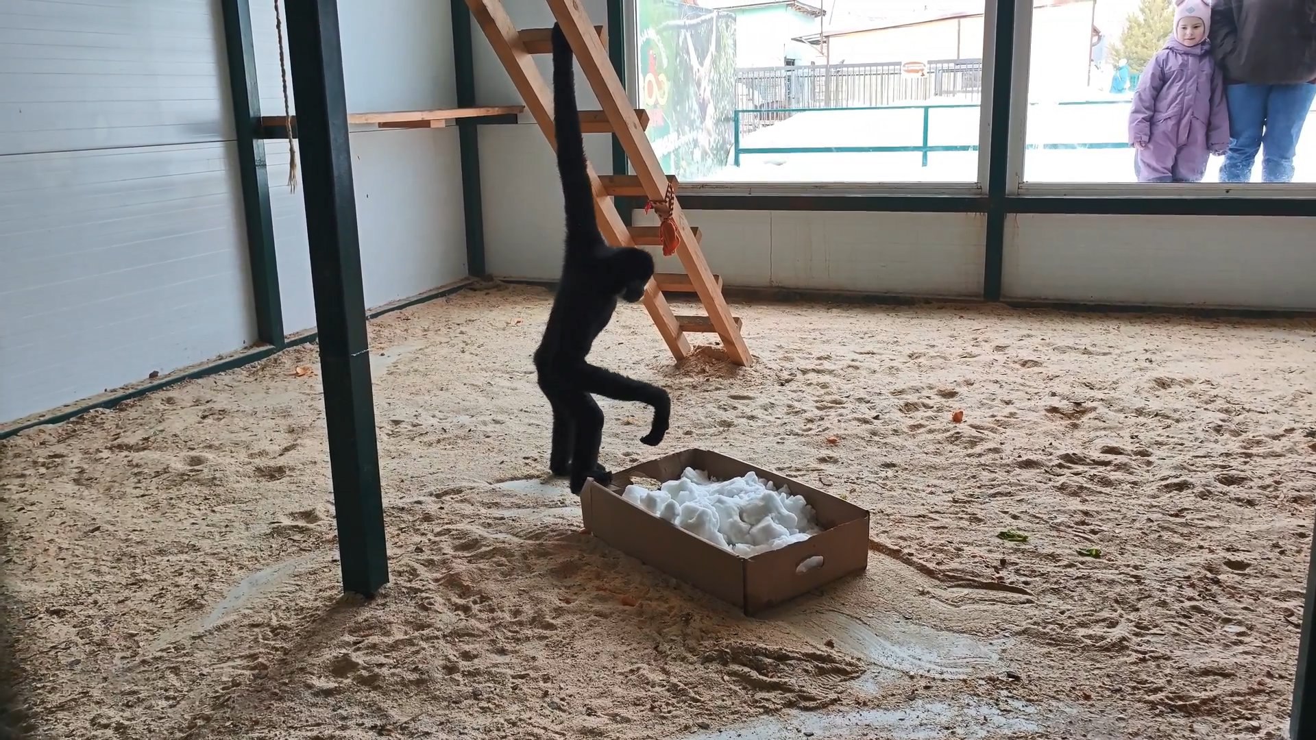 Цветок Билли сразу оценил — начал с ним играть и таскать за собой по всей клетке. А вот снег гиббону не понравился. Именинник лишь недоумённо смотрел на белое «нечто» (прямо как барнаульцы на снегопад 10 марта ) и не понимал, что с этим делать.