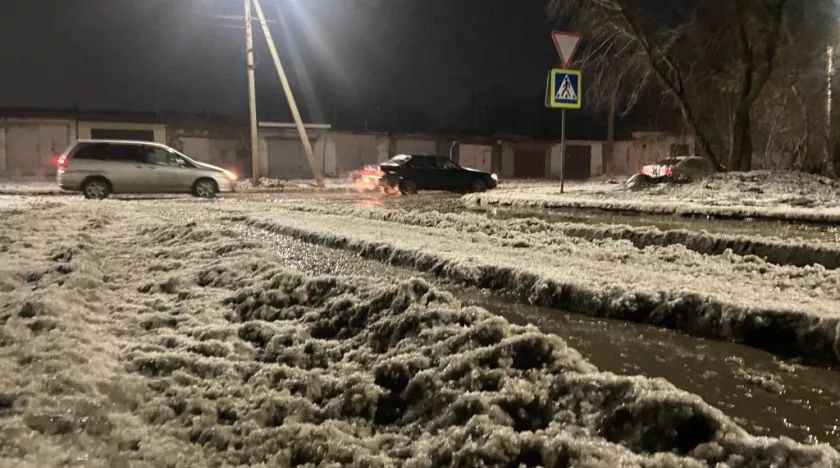 Если вчера на дорогах были лужи, то к утру они в лучшем случае замрзли ледяными буграми, а самые глубокие превратились в кашу, преодолеть которую удалось не всем. Так утром, до 7 часов, на ул. Мерлина с путей сошёл трамвай. Замерзающая лужа на остановке «Восток» «поймала» сразу несколько автомобилей. Легковушки и паркетники буквально повисли на ледяных буграх, так что пришлось вызывать помощь. На ул. Васильева на подъезде к пересечению с ул. Социалистической образовалась пробка.