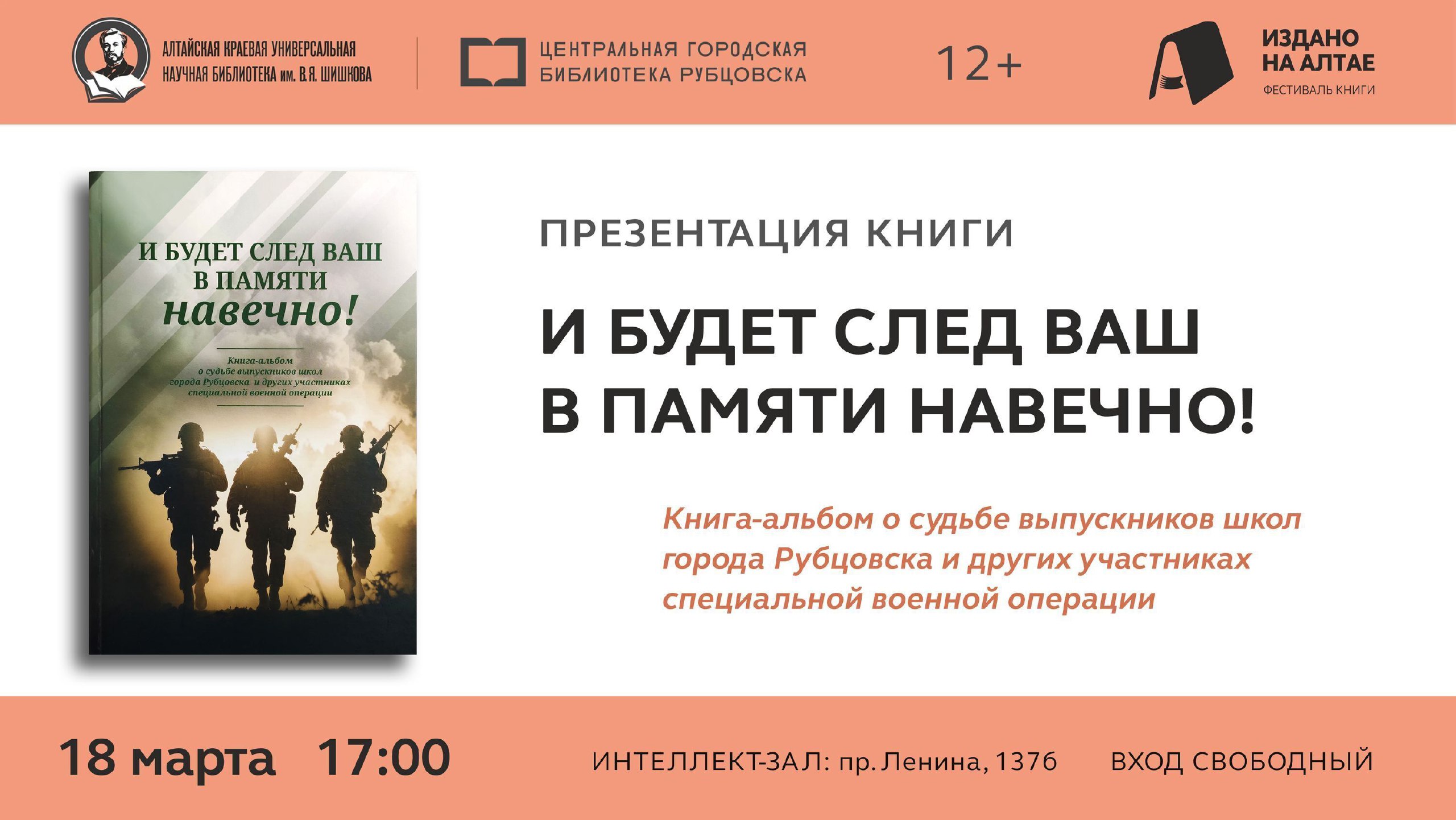 18 марта в 17:00 в рамках краевого фестиваля книги «Издано на Алтае» состоится презентация книги-альбома «И будет след ваш в памяти навечно» о рубцовчанах – участниках специальной военной операции.