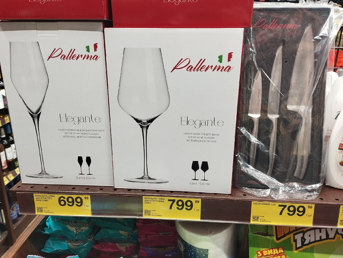 Также в продаже представлены бокалы – каждая упаковка содержит по два изделия. Их цена варьируется от 699 до 799 рублей, но, к сожалению, детально ознакомиться с ними не удастся, поскольку витрины не предоставляют возможности увидеть образцы.