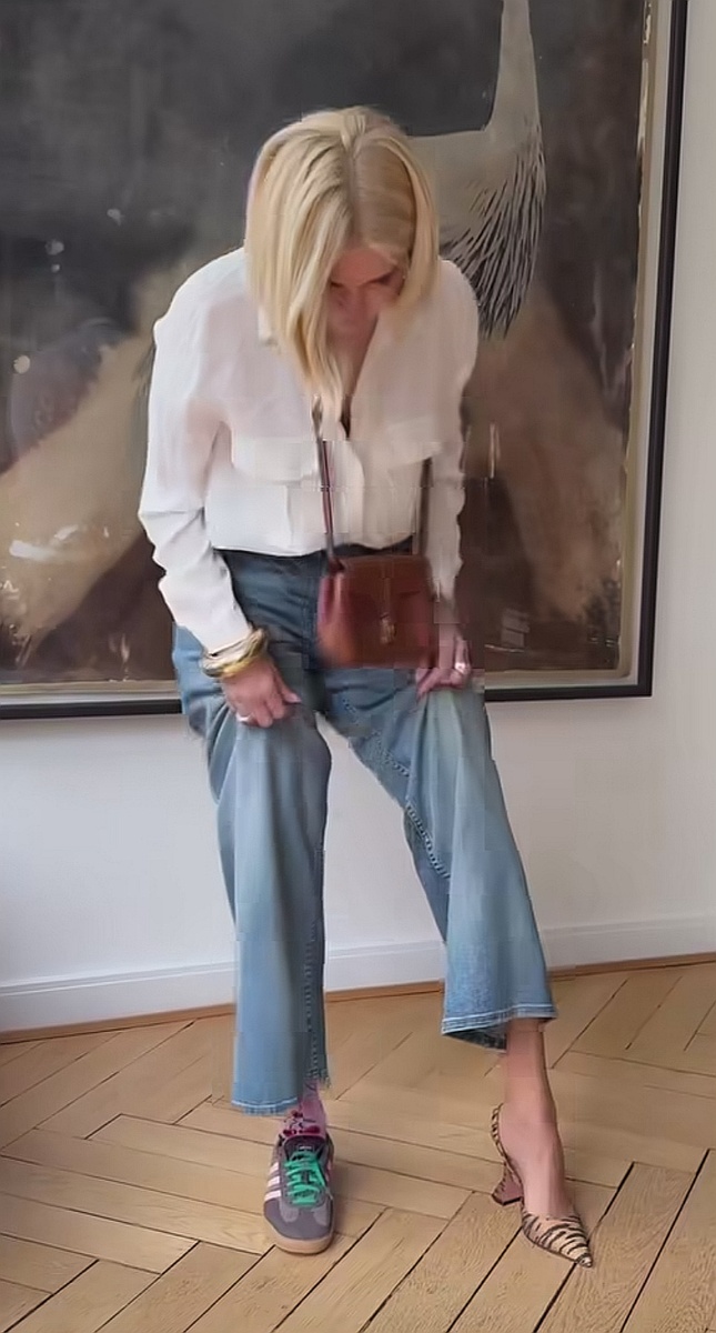 Допустимо носить с кедами, слипонами, ботильонами на каблуке. Главное, чтобы длина джинсов немного перекрывала обувь - это поможет избежать укорачивающего эффекта.