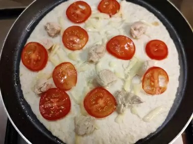 Далее, разогревается сковорода с антипригарным покрытием. После достижения нужной температуры, на среднем огне выкладывается первая тортилья. На нее равномерно распределяют немного сыра, затем укладывают помидоры и кусочки курицы. Когда первая сторона обжаривается в течение 2 минут, сверху добавляются кольца лука и посыпается зеленью вместе с оставшимся сыром. Мелко нарезанный болгарский перец раскладывается поверх остальных ингредиентов. В конце, добавляется немного соли для улучшения вкуса.