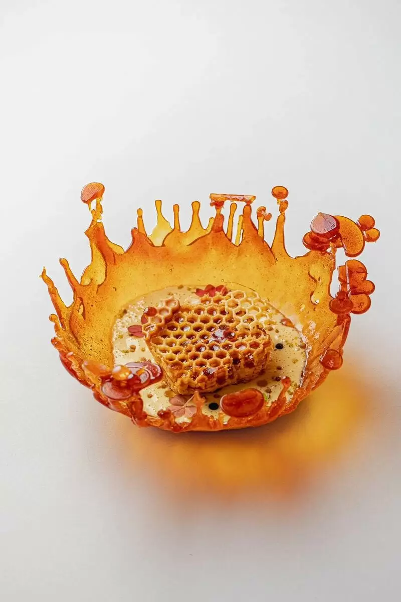 Артистическая подача медовика завершена изысканной карамельной чашей, выполненной вручную. Это не просто упаковка, а настоящее искусство, которое делает наслаждение десертом незабываемым. Каждый элемент этого блюда пробуждает чувства и оставляет впечатление, которое хочется сохранить на долгие годы.