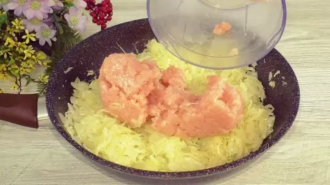Для приготовления начинки обжарьте лук с капустой, затем добавьте фарш. После этого смешайте все компоненты теста и вылейте их в форму. Запекайте пирог при 180 градусах около 40-55 минут до золотистой корочки.