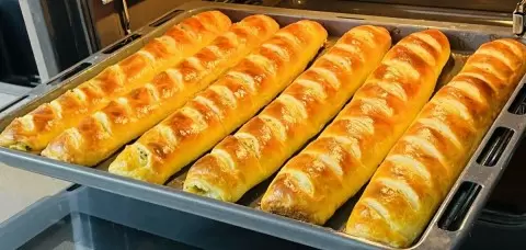 После этого из теста формируются рулеты с начинкой. Получившиеся изделия аккуратно выложить на противень, смазать желтком и выпекать при температуре 180 градусов на протяжении 25-30 минут. После завершения выпекания пахучие рулеты можно подавать к столу.
