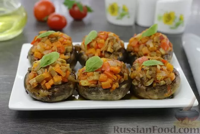 - Шампиньоны, фаршированные овощами. Грибы заполняются смесью из обжаренных овощей, а затем запекаются в духовке. Не только вкусно, но и очень красиво!