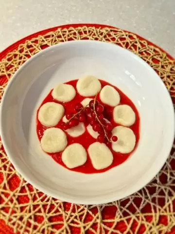 Пока вареники варятся, можно быстро подготовить соус. Красную смородину тщательно промывают и освобождают от веточек. Блендером взбивают ягоды с сахарной пудрой по вкусу – в среднем достаточно 2 столовых ложек. Соус будет идеальным компаньоном для вареников.
