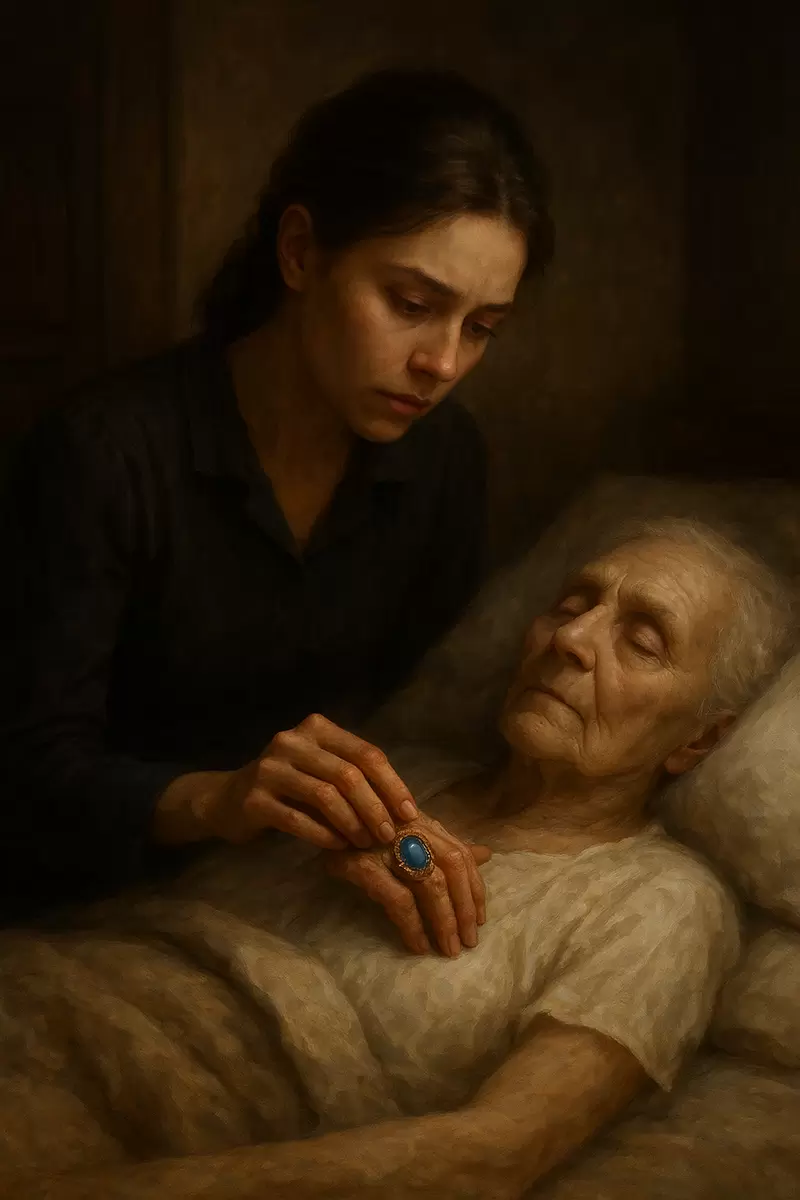 Старушка с трудом провела рукой по её пальцам и произнесла: "Я хотела всё исправить… но могла только вернуть тебе это…". Перстень сверкнул, словно прощальная слеза, и через мгновение старушка покинула этот мир.