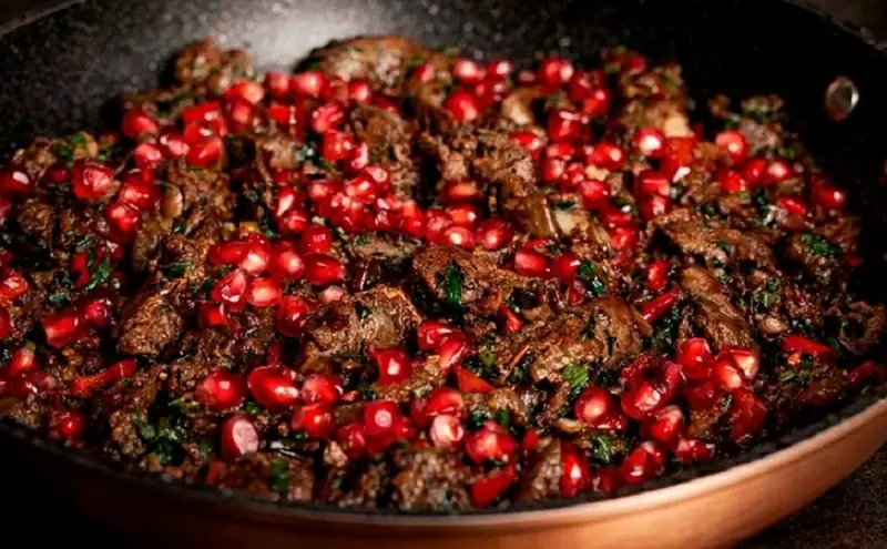 Грузинская кухня знаменита своим умением превращать простые ингредиенты в уникальные шедевры с множеством ароматов. Приготовленная по-грузински, куриная печень становится не только красивой, но и невероятно вкусной. Крупные, сочные кусочки печени обвивают насыщенный соус, а яркие акценты сладкого перца и граната подчеркивают её изысканность. Основная задача здесь — создать идеальный баланс между пряностями и кислинкой вина.
