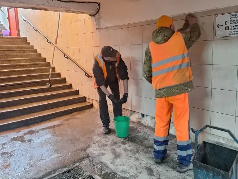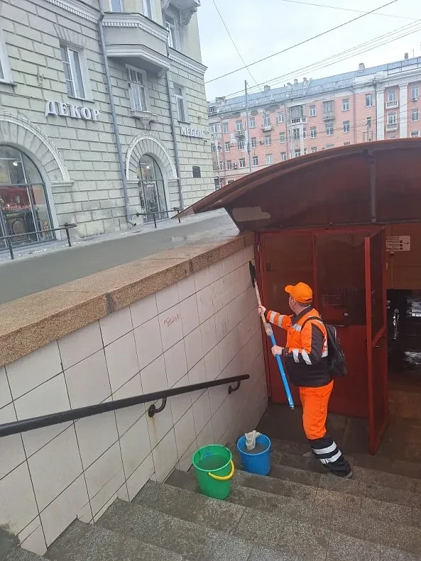Также дорожная служба проводит мойку входной зоны и внутренних поверхностей подземного перехода на площади Октября.