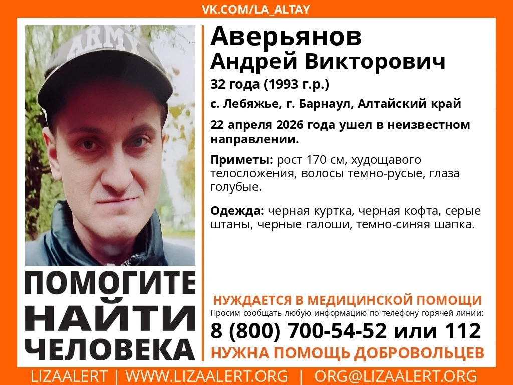 Поисковики "ЛизаАлерт" распространяют ориентировку с информацией о поиске 32-летнего мужчины из села Лебяжье. 22 апреля он ушел в неизвестном направлении. Был одет в черную куртку, черную кофту, серые брюки, черные галоши и темно-синюю шапку. Приметы: рост 170 см, худощавого телосложения, волосы темно-русые, глаза голубые. Ориентировка также гласит, что мужчина нуждается в медицинской помощи.