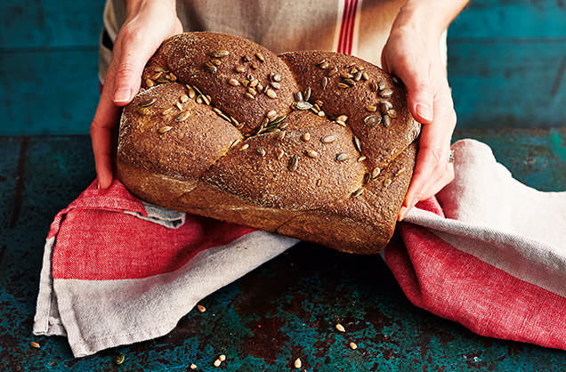 Переложите плетеное тесто в форму, накройте и дайте ему подняться еще 40-60 минут. Не забудьте разогреть духовку до 240 °C. После того как тесто подняло, смажьте его водой и посыпьте семенами тыквы и подсолнечника. Выпекайте хлеб в предварительно разогретой духовке в течение 35 минут при температуре 220 °C.