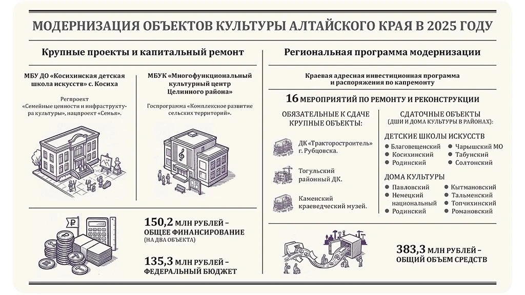 Он также рассказал о планах на 2026 год: будет продолжена реконструкция музыкального колледжа в Барнауле; капремонт домов культуры Змеиногорского, Локтевского и Угловского районов и многофункционального культурного центра в Тальменском районе.