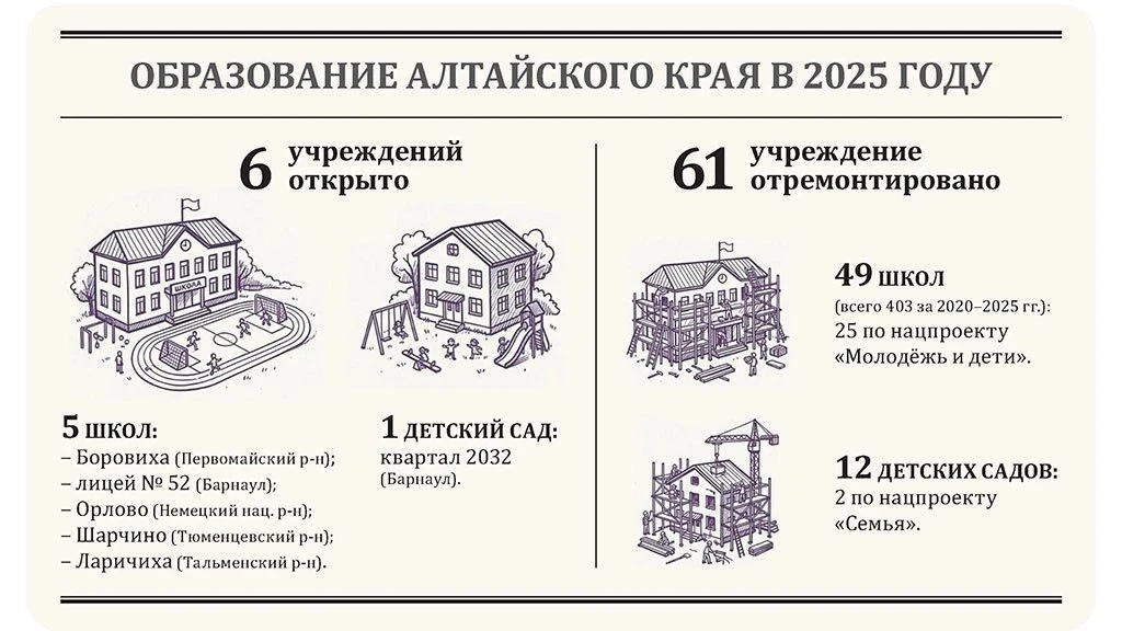 В настоящее время в Алтайском крае идет строительство четырех школ: в селе Покровка Родинского района (на 90 мест), в городе Бийске (на 350 мест), в селе Бочкари Целинного района (на 297 мест), в квартале 2033 города Барнаула (на 1100 мест). Также в рамках программы модернизации образовательных организаций в 2026–2027 годах запланирован капитальный ремонт 49 зданий школ и 10 детских садов, 10 колледжей. По большинству объектов работы уже ведутся.
