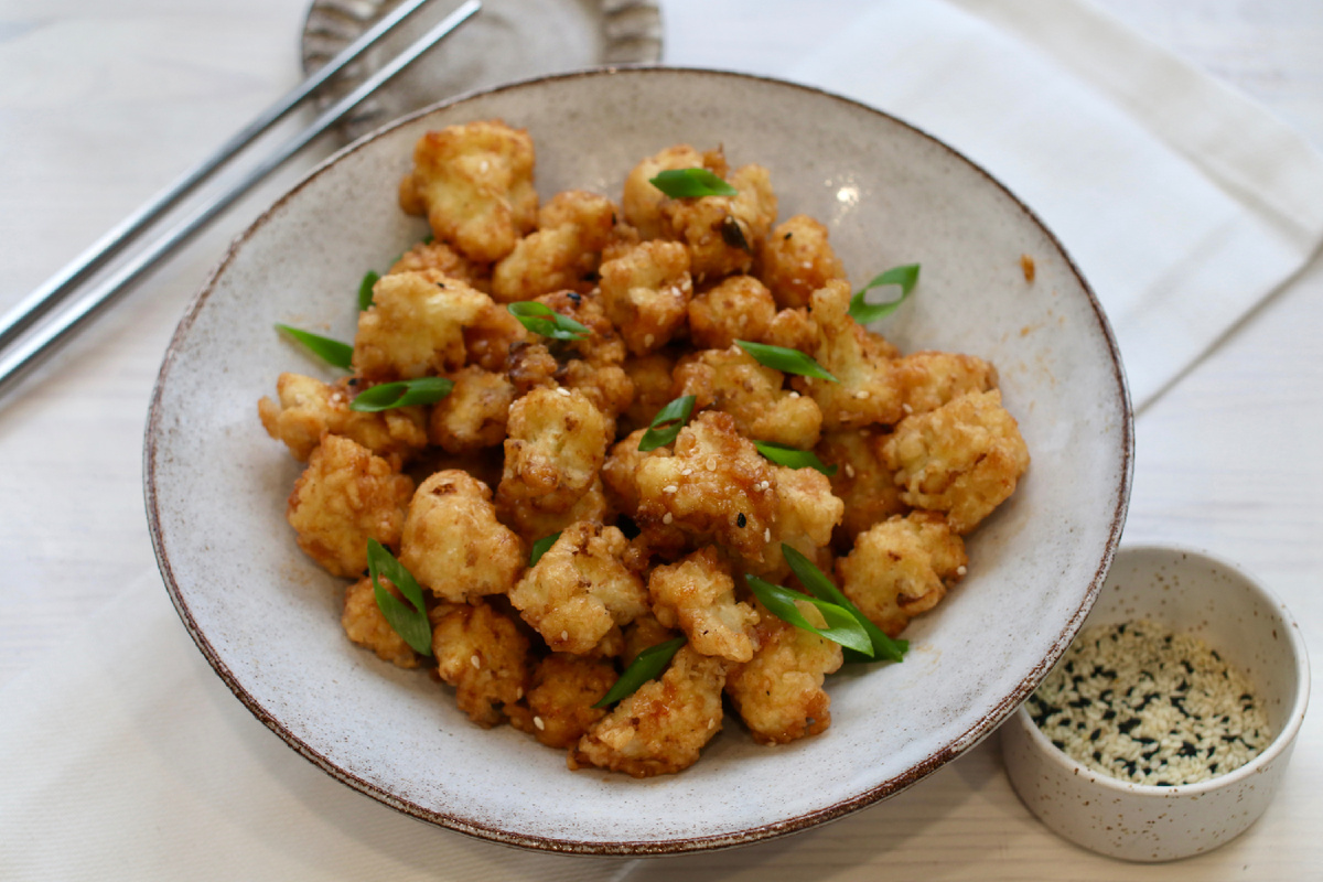 Восхитительная заправка готовится из соевого соуса и соуса кимчи, после чего ею поливается цветная капуста. Заправленное блюдо помещается в салатник и посыпается кунжутом. Это идеальное угощение лучше подавать сразу, чтобы сохранить хрустящую текстуру капусты.